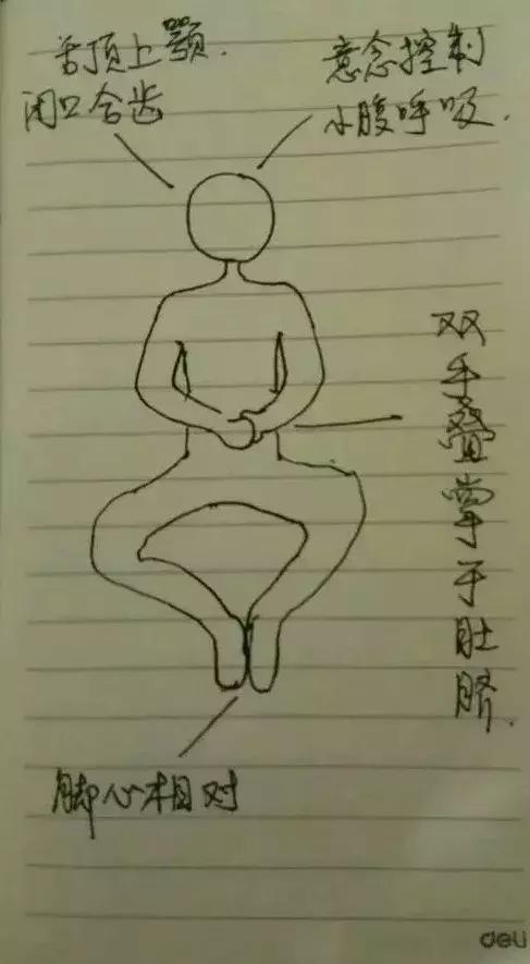 每晚睡前都可以练,平躺,双手两掌叠放肚脐。闭口合齿,舌顶上颚。双脚掌相对,屈膝。如图。才刚练的朋友,胯会酸痛。